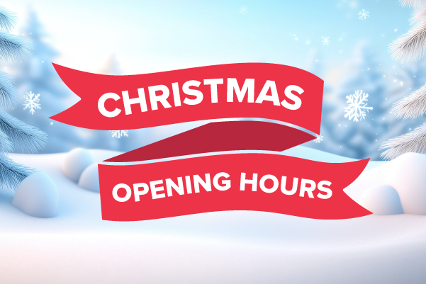 Wednesday 24th December – Christmas Eve – 9:00 – 14:00 Thursday 25th December (Christmas Day): Closed Friday 26th December (Boxing Day): Closed Saturday 27th December: 09:00 – 17:30 Wednesday 31st December (New Years Eve): 09:00